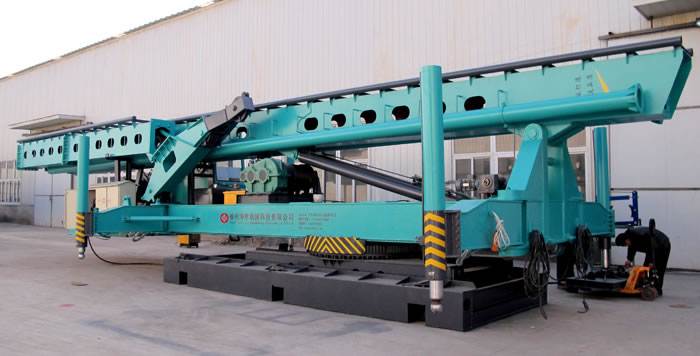 桩机主架采用折叠式,使臂架的收放更加便捷、高效,避免上节滑道的二次安装,同时,上下两节间采用了法兰式刚性联接,使得臂架在使用过程中更加稳定,使桩机在施工中不再出现臂架晃动的现象。